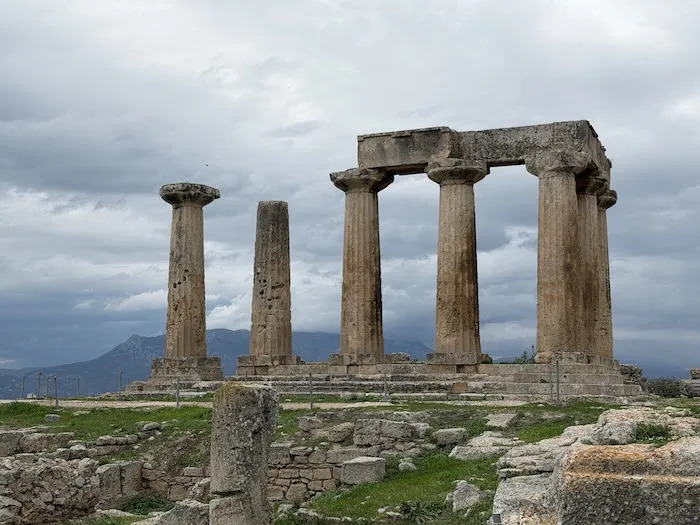 While most Greek temples of the time were constructed of limestone and coated with stucco, Corinth went bigger. They quarried thirty-eight monolithic limestone columns, each carved from a single seven-ton block. No stacked drums. No segmented shafts. This was uniquely ambitious and technically demanding.