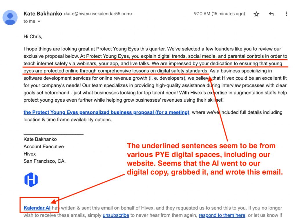 This AI-written email was received by PYE Founder, Chris. It’s obvious that the AI studied our website and grabbed a copy from the site to craft the email: