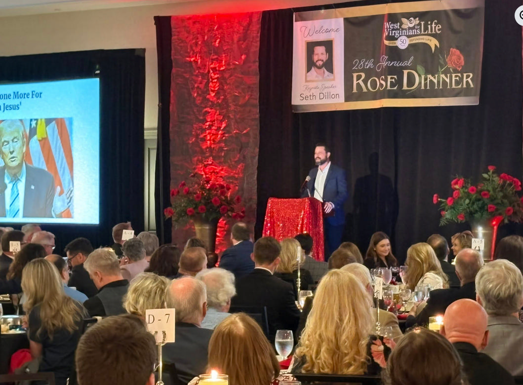 Babylon Bee CEO Seth Dillon was insightful and humorous in his keynote address at the 28th Annual Rose Dinner on Friday, April 17, in Morgantown. Seth built an excellent case for the fact that freedom of speech is foundational to the ability to publicly defend (and some cases, exercise) every other right guaranteed in the U.S. Constitution – including the right to life. As a part of the introduction, the audience observed Dillon masterfully doing exactly that on a clip from Joe Rogan’s show.