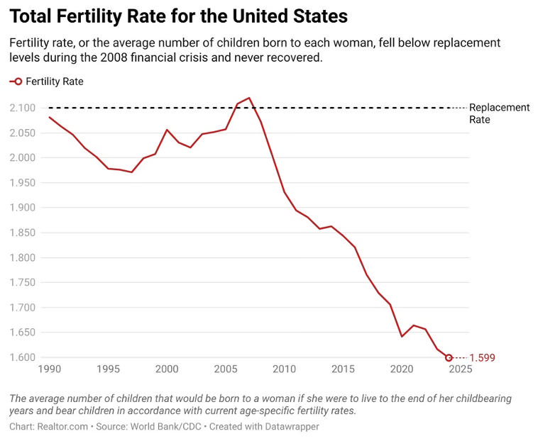 Total fertility rate — the average number of children born to each woman — was approximately 2.08 in 1990, but down to 1.64 in 2020 and 1.59 in 2025 according to CDC data. A fertility rate of at least 2.1 is considered the replacement rate, or the rate at which each generation has enough children to maintain a steady population in the future.
