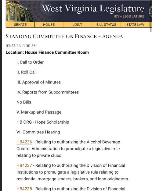 HB ORG (House Finance Committee) – HOPE Scholarship Bill. The purpose of this bill is to restrict the HOPE Scholarship. It would include, freezing the scholarship amount, restrict extra-curricular expenditures, limited technology purchases, and ban out of state payment among other items. Scheduled for Committee discussion and mark-up, 1/20/26. Finance Committee adjourned before bill was brought up. *The WVCEA urges all schools and families to actively oppose this bill.